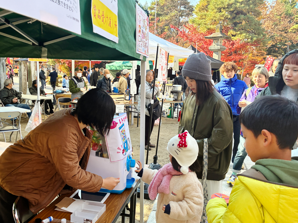 「なぞとき『数独』パズルラリー in まつもと城下町」は、神社周辺の商店街(上土・緑町・ナワテ・大名町)の4カ所に設置されたチェックポイントを巡り、数字を集めて数独パズルを解くパズルラリーイベント。パズルを正解した参加者全員に、参加賞として「オリジナル缶バッチ」と「数独千代紙(1枚)」が、さらに、アンケート回答すると、上土シネマミュージアム「出張!しょうふく祭レトロガチャ」の挑戦コイン(定価200円)も1枚プレゼントされました。